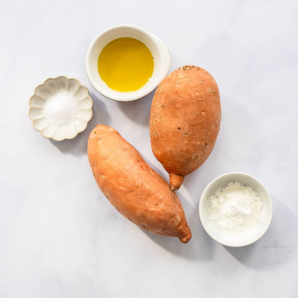 Sweet potatoes: of course, you’ll need sweet potatoes to make these fries. For this recipe, you’ll need about 2 medium potatoes. You can also try this method with sweet potato wedges but they won’t be quite as crisp.