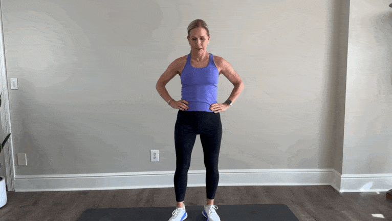 How to do it: Stand tall, hands on your hips. Slowly lift your right leg in a circular motion (like you are lifting it up and over a step stool). And then bring it back the other direction. Do it 5 times on the right and then repeat on the left leg.