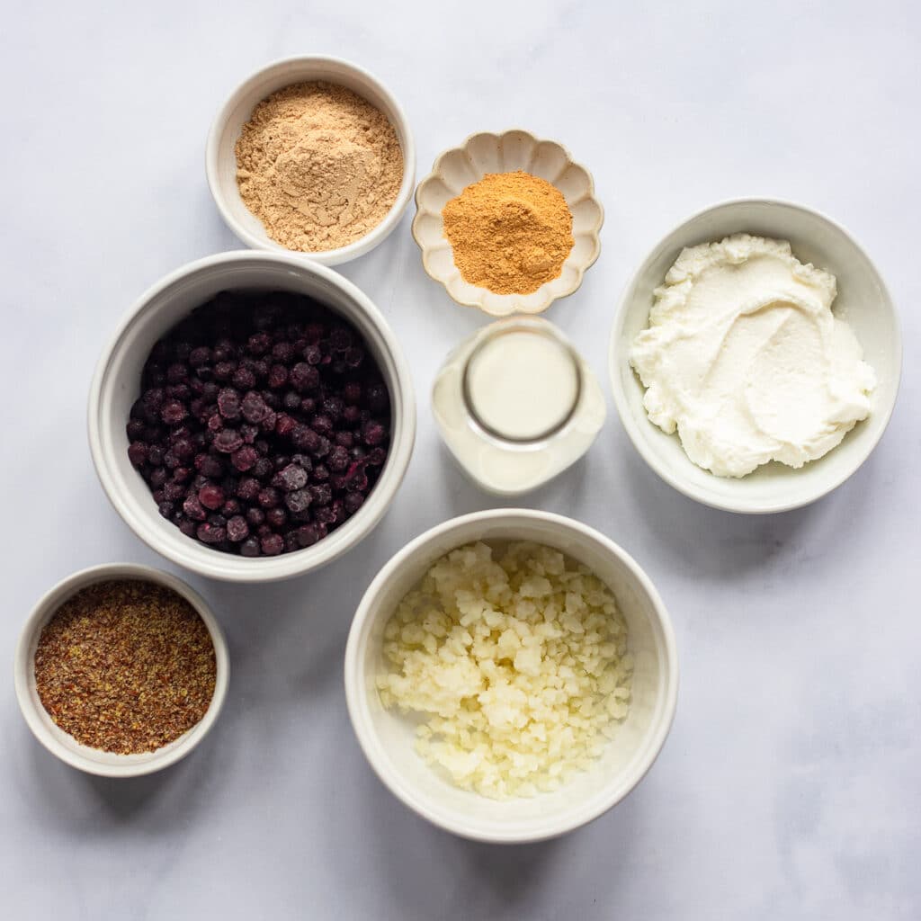 Prep: Add all of your ingredients (blueberries, milk, cauliflower rice, yogurt, protein powder, flax seed, and maca) to a high powered blender.