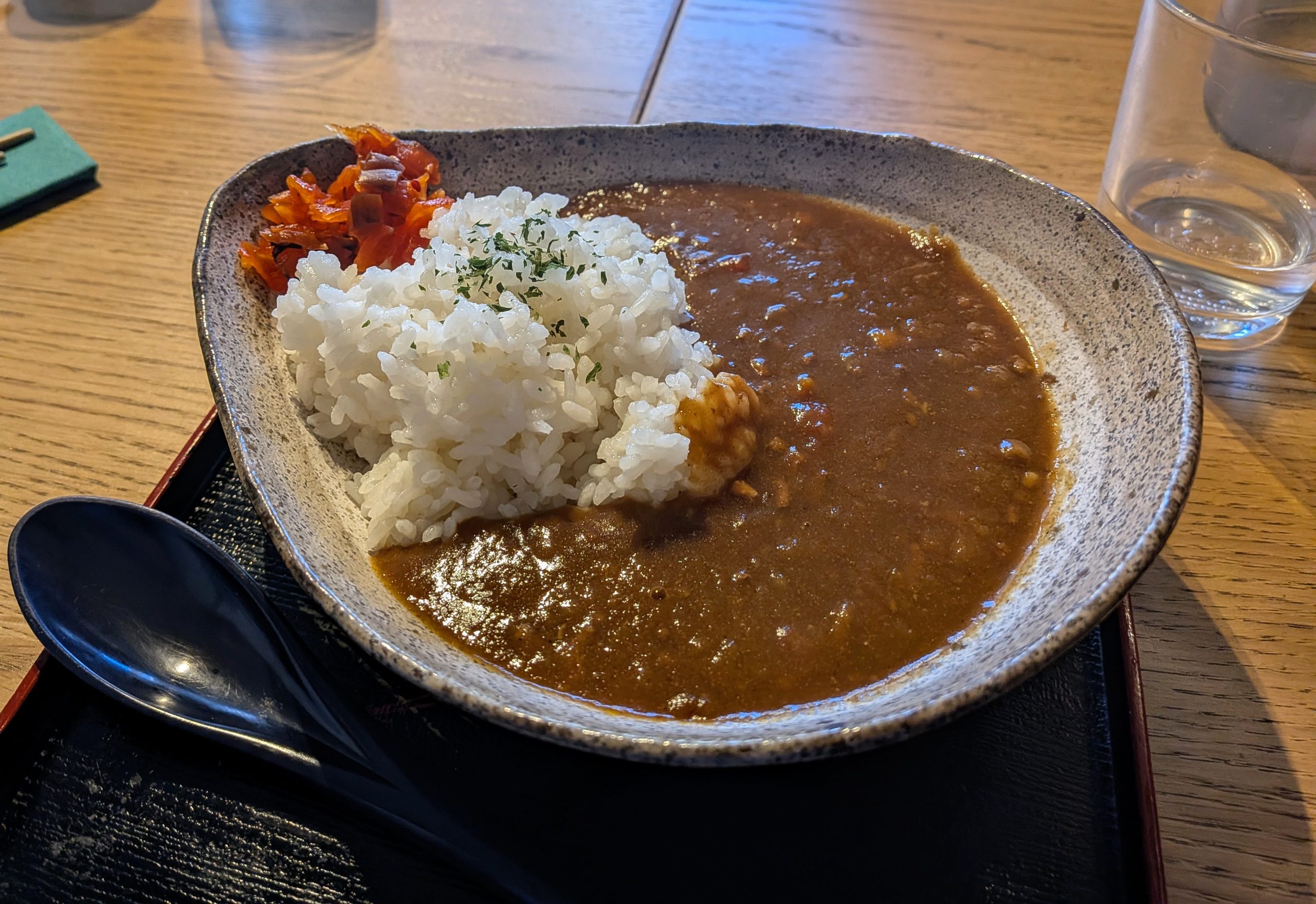 By comparison to the starters there were a wealth of options for the main. Unusually a curry caught my eye. It might not look much, but a more enjoyable and comforting bowl of lunch I can’t remember! The menu had described it as ‘Sora original Keema curry’. In the course of my research for this piece I didn’t find much consensus on what makes the dish, it seems open to quite a bit of individual interpretation but correct me if I am wrong. Sora’s version at least was mostly a minced beef in a sauce that had a really nice depth and a pleasing amount of spice (by Japanese levels). Desert is part of the lunch deal and whilst there were lots of exciting options I only had room for some ice cream. They have one unique home made flavour per month but I went more a palate cleansing strawberry which was a perfect way to finish.