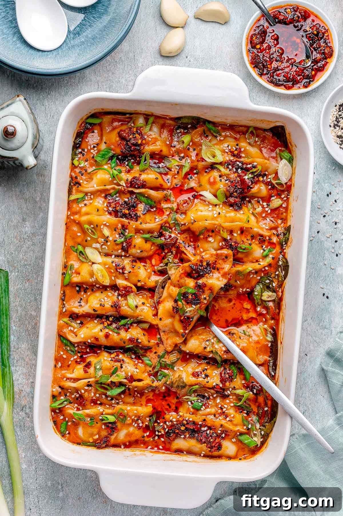 Some of the most cherished recipes are those that surprise you with their simplicity and an unexpected depth of flavor. These one-pan baked dumplings perfectly embody that principle! Utilizing readily available frozen dumplings—whether you prefer chicken, vegetable, or pork varieties—they are gently baked in an exquisite creamy coconut curry sauce. This rich sauce is meticulously crafted with aromatic garlic, a hint of sweet honey, savory soy sauce, and nutty sesame oil, creating a comforting and boldly flavored foundation for your meal. The addition of fresh spinach not only introduces a vibrant pop of color but also a delightful, savory freshness that complements the sauce beautifully. To elevate each bite, a final garnish of toasted sesame seeds, thinly sliced green onions, and a drizzle of spicy chili crisp adds layers of texture and an irresistible kick.