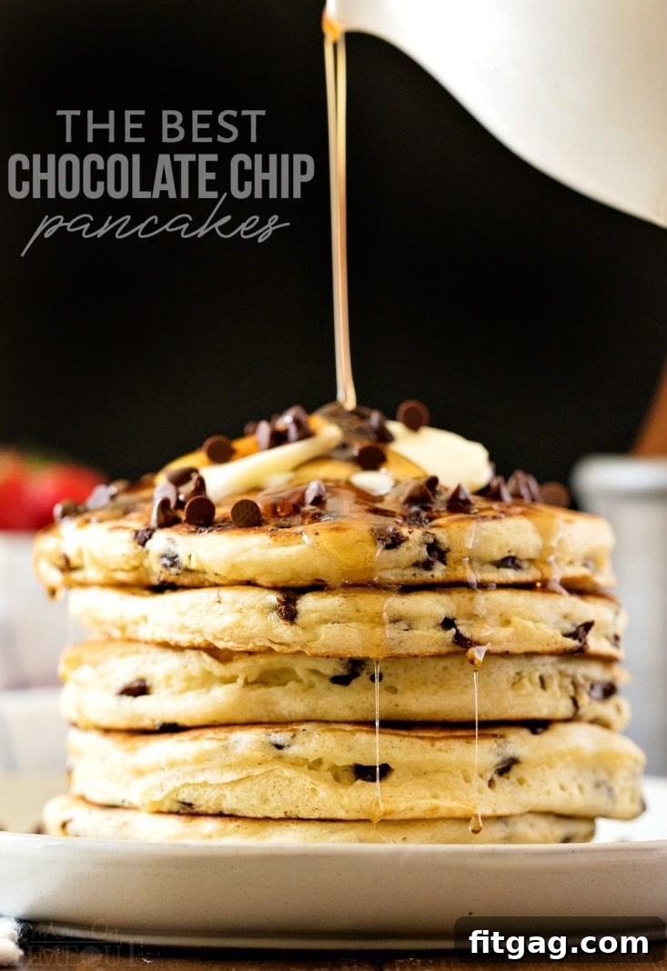 Get ready to experience the BEST Chocolate Chip Pancakes you’ll ever taste! This simple, straightforward recipe consistently delivers incredibly delicious and perfectly amazing pancakes every single time. Forget the grainy, bland box mixes; these pancakes are ultra fluffy, rich, and generously studded with gooey chocolate chips. Pair them with crispy baked bacon and a drizzle of warm maple syrup for the most delightful and satisfying breakfast imaginable!