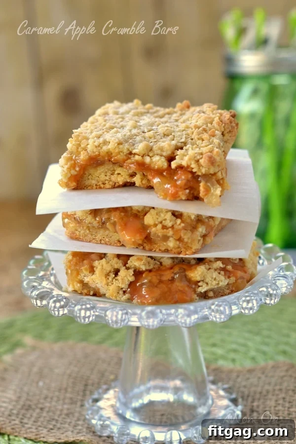 Let’s be unequivocally honest: the true star of these bars is undoubtedly the generous, luscious layer of oozing caramel goodness. Whether you choose to savor these delectable treats warm, fresh from the oven with its comforting embrace, or allow them to cool to perfect room temperature for a firmer, yet equally delicious bite, the combination of rich caramel, tender sweet apple filling, and the crunchy, buttery crumble topping orchestrates a magnificent symphony of flavors and textures that is simply impossible to resist. Each and every bite delivers a harmonious blend of sweet and subtly tart notes, enveloped in comforting warmth, creating an experience that is both indulgent and familiar. They are an instant crowd-pleaser, perfect for any celebratory gathering, holiday feast, or simply for a cozy, quiet evening spent at home.