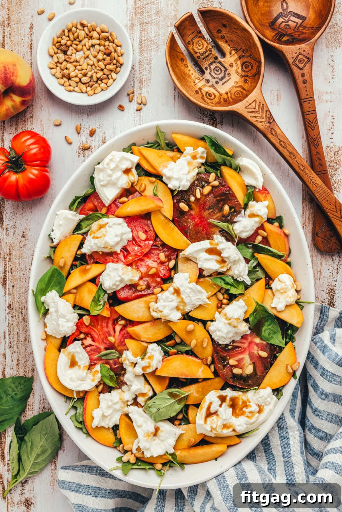 Remarkably Versatile: While hearty enough to stand alone as a light, satisfying summer main course, this **Peach Burrata Salad** also excels as a sophisticated side dish. It pairs beautifully with a wide array of main dishes, from grilled chicken and fish to pasta and pizzas. It’s truly perfect for any occasion, adapting effortlessly to your menu needs.