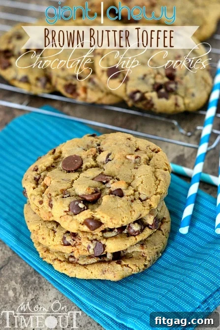 Beyond the incredible flavor, the process of making these cookies is a joy in itself. The browning butter fills your home with an aroma that promises warmth and comfort, setting the stage for the deliciousness to come. The simple act of mixing, chilling, and baking culminates in a treat that’s not just food, but an experience. They are perfect for sharing with loved ones, bringing to a potluck, or simply enjoying during a quiet moment of personal indulgence with a tall glass of milk or a hot cup of coffee. No matter the occasion, these **Giant, Chewy Brown Butter Toffee Chocolate Chip Cookies** are guaranteed to be a showstopper and a crowd-pleaser.