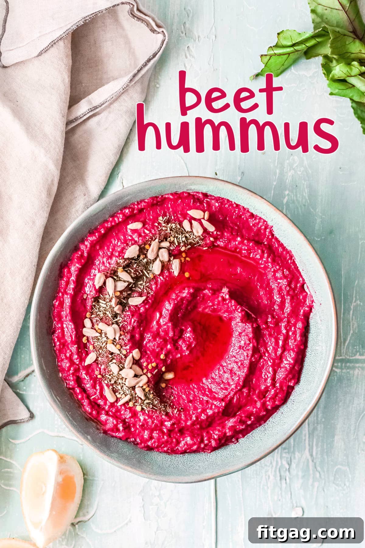 Beet hummus is incredibly versatile! Serve it as a dip with fresh vegetables like cucumber slices, carrot sticks, and bell pepper strips, or with pita bread and crackers. It also makes an excellent spread for sandwiches, wraps, and toast. For a more elaborate meal, dollop it onto grain bowls, spread it on flatbreads, or serve it alongside grilled chicken or falafel. Its vibrant color also makes it a fantastic addition to charcuterie boards or appetizer platters.