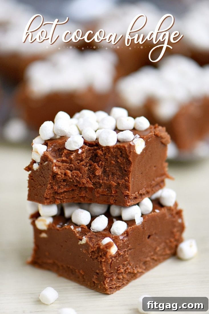 Prepare for a taste sensation that will transport you straight to a cozy winter wonderland! This easy Hot Cocoa Fudge is an exceptionally creamy and deeply decadent confection that will melt in your mouth. More than just a dessert, it’s the perfect treat to brighten any cold winter’s day or to add a touch of festive magic to your holiday cookie trays. Whether you’re planning for Christmas, a holiday gathering, or simply craving something sweet and comforting, this homemade hot cocoa fudge delivers pure bliss. It’s so simple to make, yet incredibly satisfying, making it a firm family favorite and a delightful gift for friends and loved ones. Get ready to create a batch of this heavenly chocolate and marshmallow delight that truly captures the essence of a warm cup of hot cocoa in fudge form.