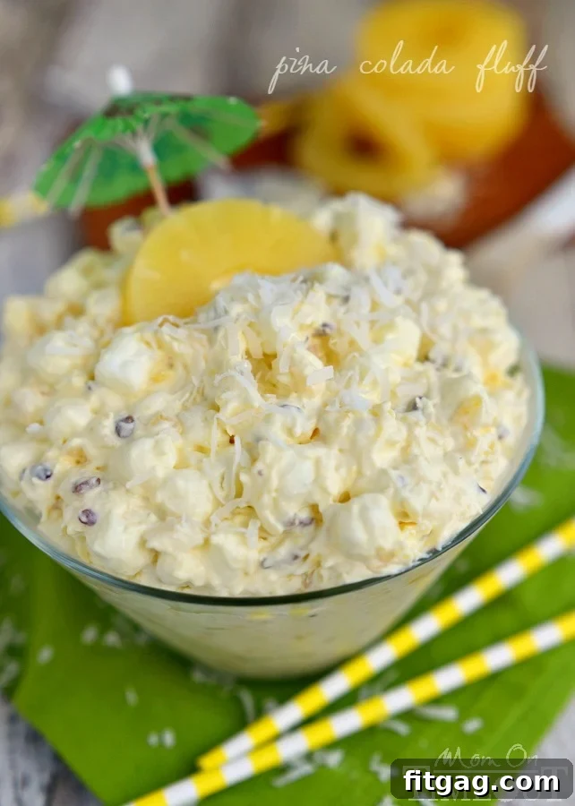 The beauty of this Pina Colada Fluff lies not only in its taste but also in its incredible versatility. It’s a guaranteed crowd-pleaser, making it the ideal addition to any social gathering. Think summer potlucks, family barbecues, holiday dinners, or even just a casual get-together with friends. It’s so quick to assemble that you can literally pull it together in about two short minutes, and I guarantee it will be “inhaled” just as quickly! Its vibrant tropical flavors are a refreshing contrast to heavier desserts, and its light, airy texture makes it incredibly easy to enjoy, especially after a hearty meal. This dessert salad proves that you don’t need to spend hours in the kitchen to create something truly spectacular that will leave everyone asking for the recipe.