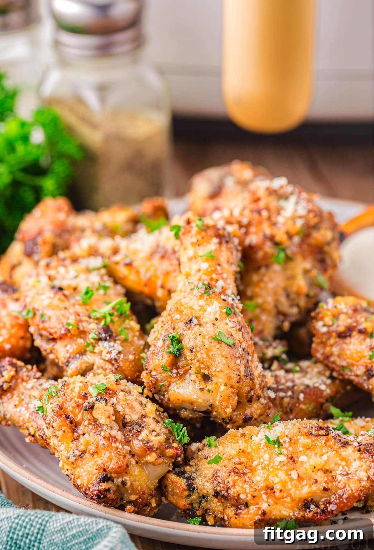 Each wing undergoes a meticulous preparation: first seasoned to perfection, then baked in the oven or crisped to golden glory in an air fryer. The magic truly happens when they are generously tossed in a rich, aromatic garlic butter sauce and then dusted with finely grated Parmesan cheese, which toasts beautifully to create an irresistible, crunchy coating. This recipe embodies the perfect balance of simplicity and maximum flavor, utilizing straightforward ingredients and easy-to-follow instructions to deliver wings that are spectacular with minimal fuss. It’s truly our favorite kind of recipe – high reward for low effort!