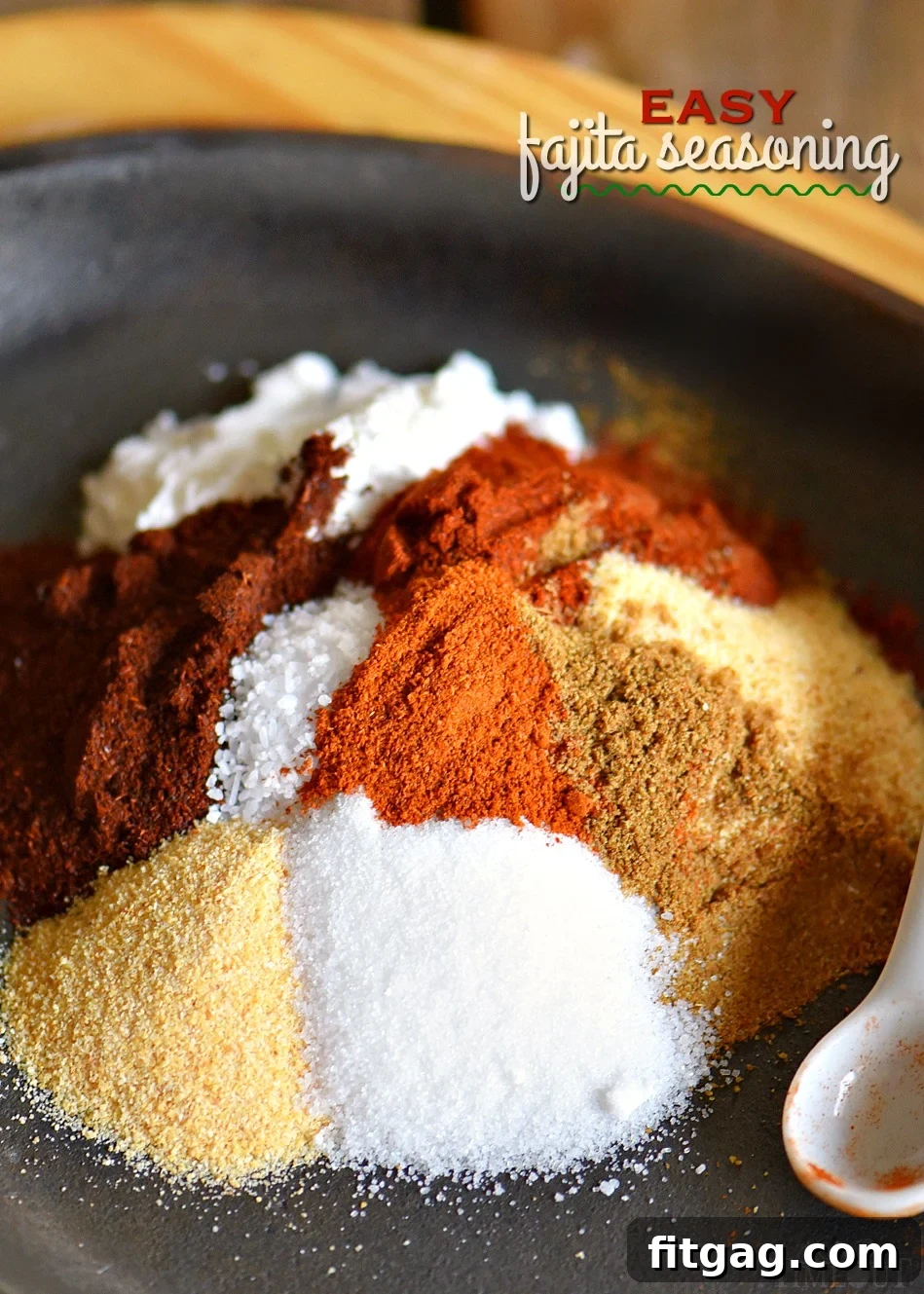 Cornstarch (optional): This ingredient is a secret weapon for creating a slightly thicker, saucier consistency when cooking your fajitas. It helps to bind the juices, forming a light slurry that coats your meat and vegetables beautifully. It has no impact on flavor, so feel free to omit it if you prefer a drier rub or are using the seasoning right away as a dry rub.