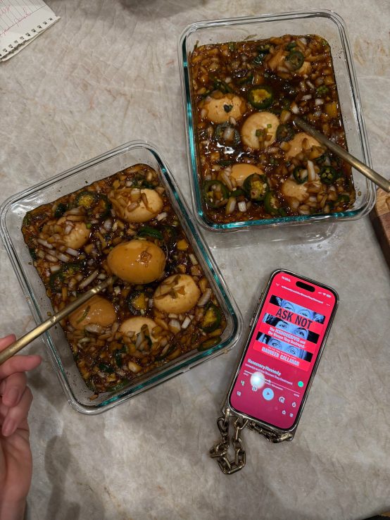I tried my own version inspired by the caramelized eggs I ate growing up in Vietnamese “thit kho.” I basically doubled the honey and then because I love onions and am sensitive to salt, I added more onions and eggs to reduce the salt content per egg!