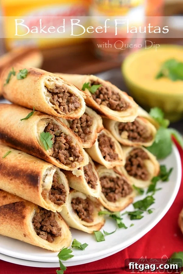 Prepare to delight your guests with these irresistible Baked Beef Flautas with Queso Dip – the perfect crowd-pleasing appetizer or a fantastic quick and easy dinner! Say goodbye to greasy frying and hello to crispy, golden perfection straight from your oven. This simple yet spectacular flauta recipe is ideal for game day gatherings, festive celebrations, or a satisfying weeknight meal. For a truly complete fiesta, serve these savory flautas alongside homemade Easy Mexican Rice and creamy Slow Cooker Refried Beans.