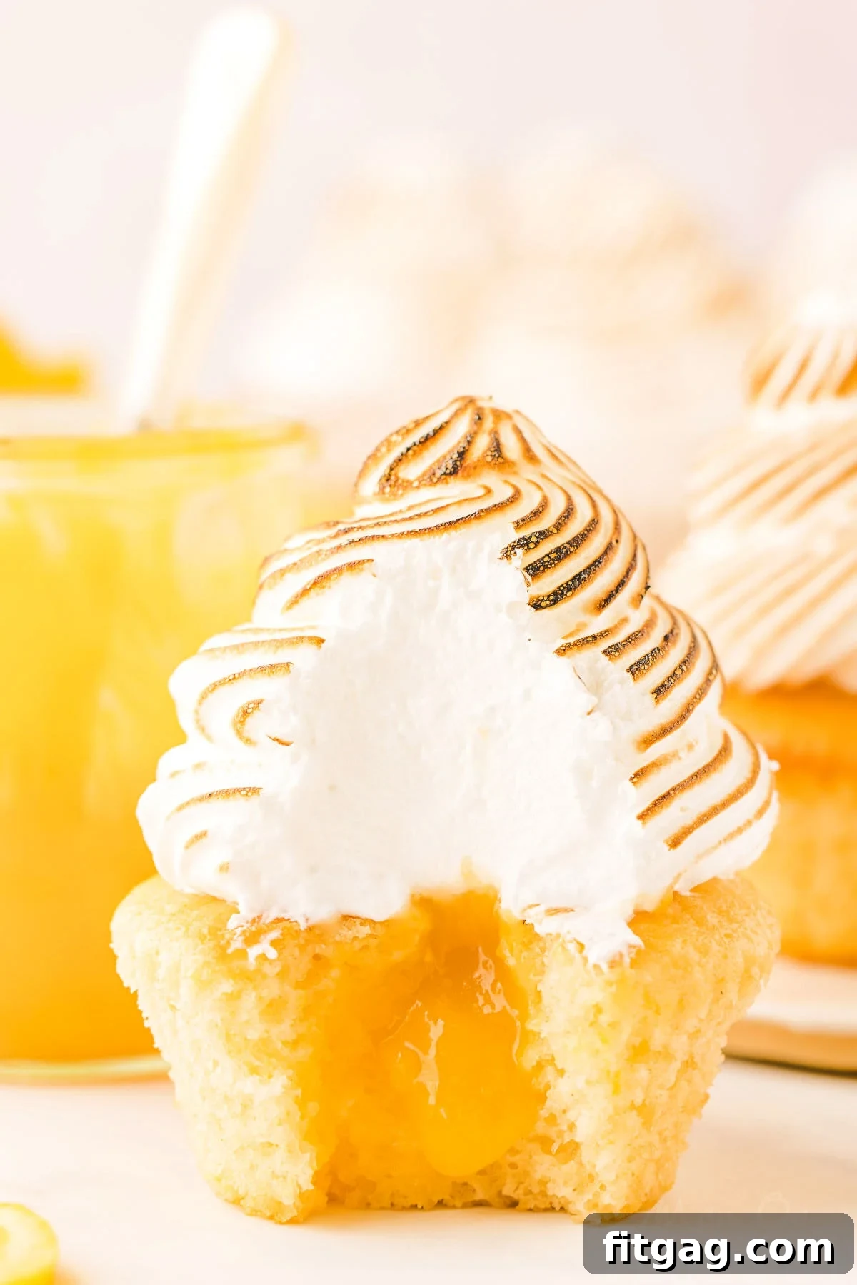 Imagine: a foundation of moist, impossibly light lemon-infused cupcakes, each a pillowy canvas for the vibrant flavors to come. These are then generously filled with a velvety smooth lemon curd – you can opt for the convenience of store-bought or elevate your baking game with our simple homemade lemon curd recipe detailed below. The grand finale is a crowning glory of impeccably toasted meringue, delicate yet substantial, providing a beautiful visual contrast and a satisfying textural crunch. It’s a truly heavenly blend of tart lemon and airy meringue that will undoubtedly make anyone’s mouth water and leave them longing for another.