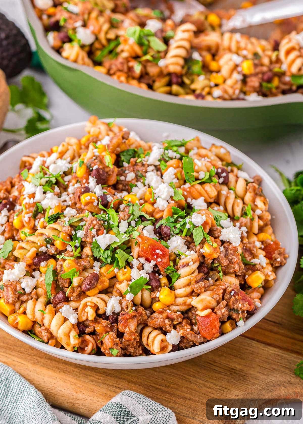 Cheesy Taco Pasta Extravaganza: For an unbelievably decadent and cheesy version, stir in 1 to 2 cups of shredded Mexican blend cheese (or cheddar, Monterey Jack, or even pepper jack for a kick) into the pasta mixture just before adding the cilantro. The melting cheese will create a wonderfully creamy and indulgent dish that cheese lovers will adore.